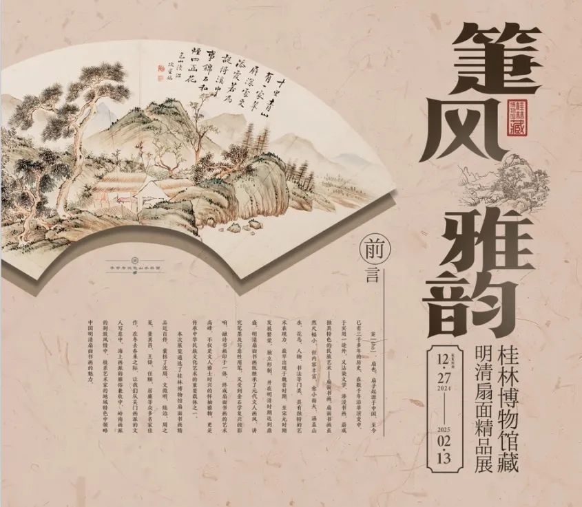 展览遴选了桂林博物馆扇面书画精品近百件,囊括了沈周、文徵明、陆治、周之冕、董其昌、王铎、任颐、居廉等众多名家佳作。让观众从吴门画派的文人写意中、海上画派的雅俗兼收中、岭南画派的别致风情中、桂系艺术家的地域特色中领略中国明清扇面书画的魅力。